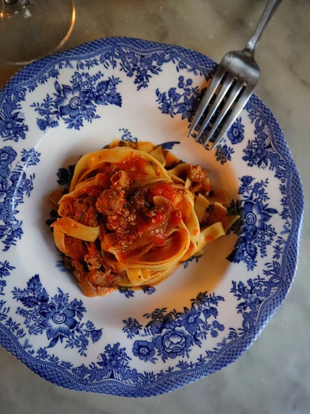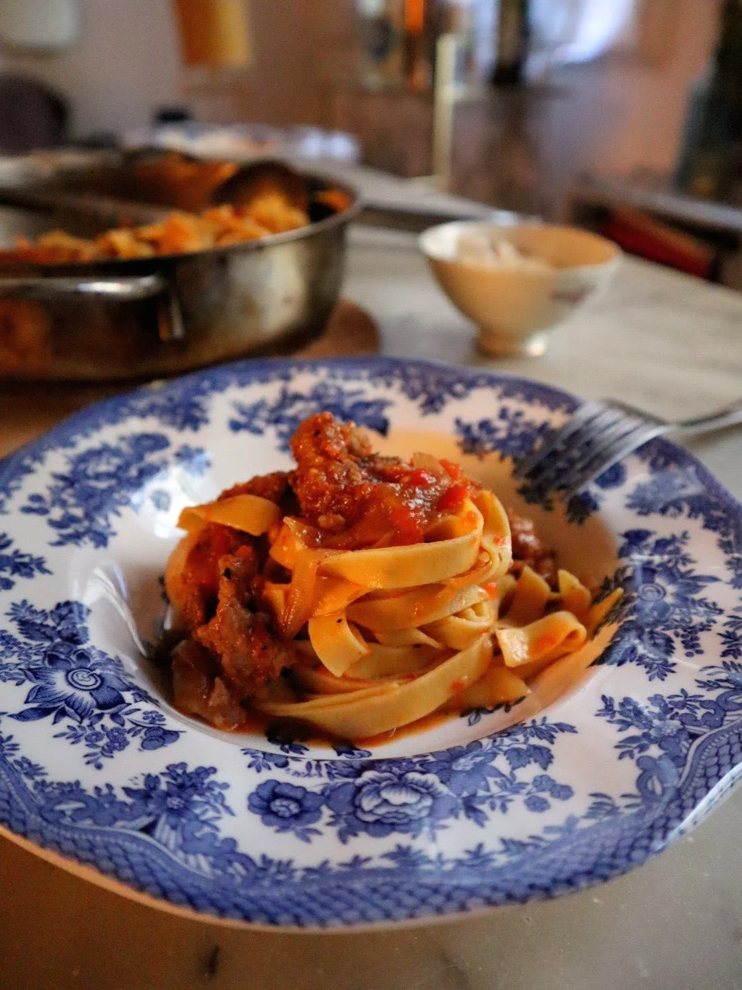 Cook your tagliatelle or your favorite pasta, drain and add to the pan with the ragu. Add a splash of the pasta cooking water as needed, and stir well to marry the sauce to the pasta. Plate and enjoy!