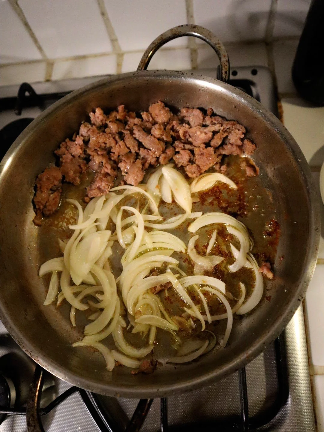 In a medium sauce or sauté pan drizzle with EVOO, add the sausage that has been removed from the casing. Break the sausage up into small pieces, and cook until they are no longer pink. Push the sausage to the side of the pan, and add the onions in the center. Sauté the onions on medium until the onions are soft. Combine the sausage and onions well. If using wine, add a splash of wine and pick up any bits stuck to the pan.