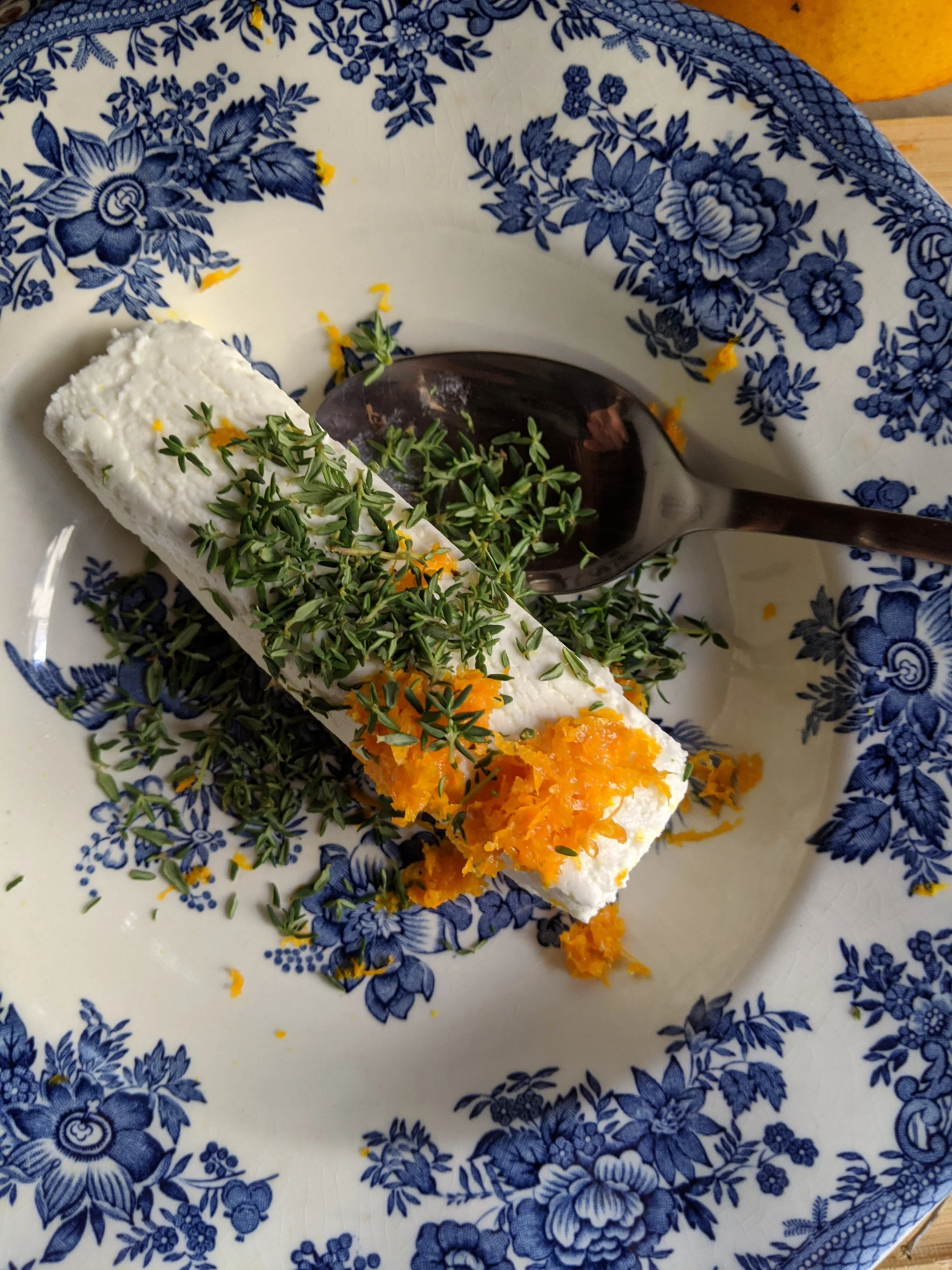Take the creamy goat cheese, orange zest and mix in a small bowl. Ad the thyme which has been removed from the sprigs, and stir. Thin out with EVOO as needed to have a creamy spreadable consistency
