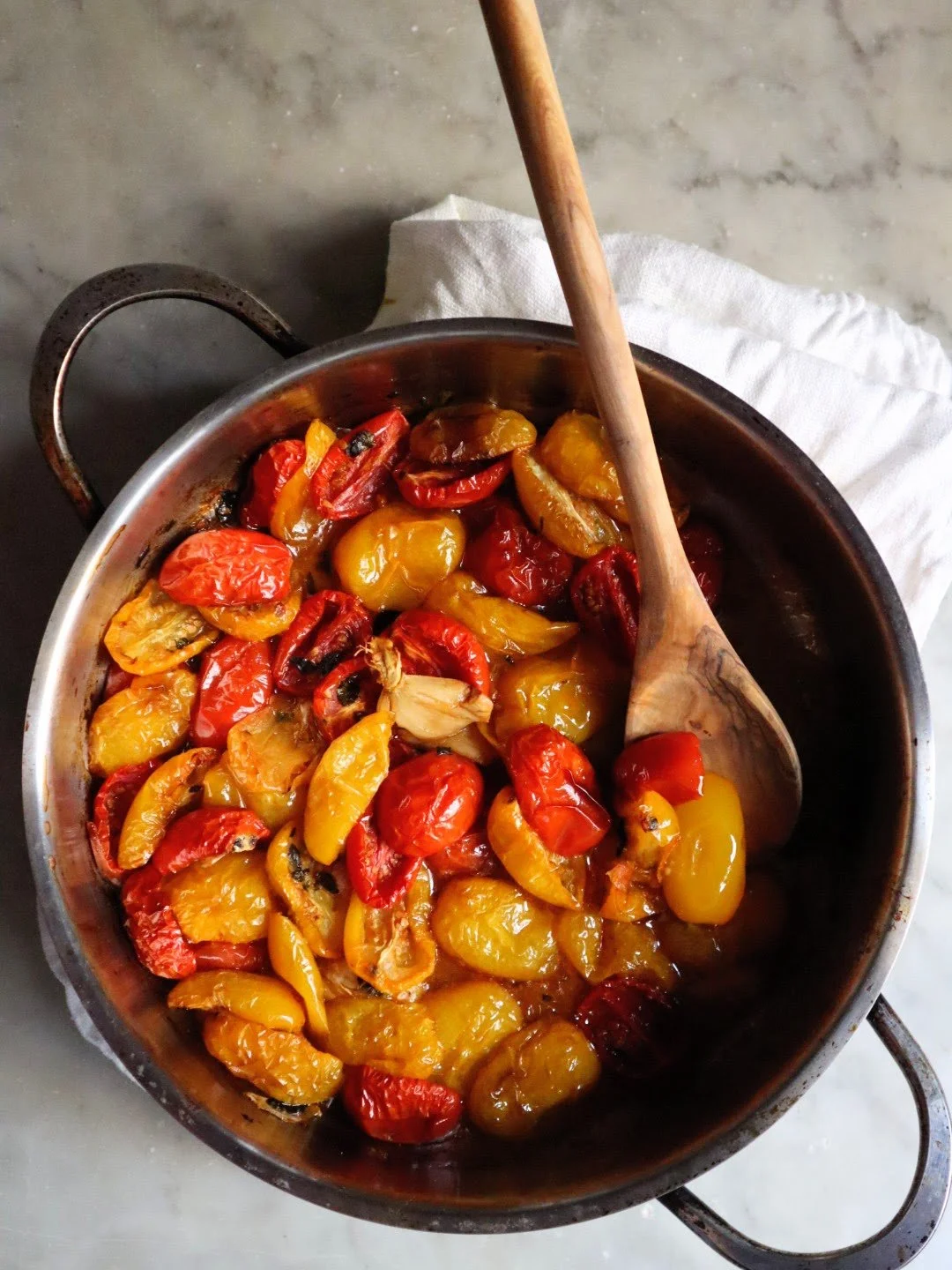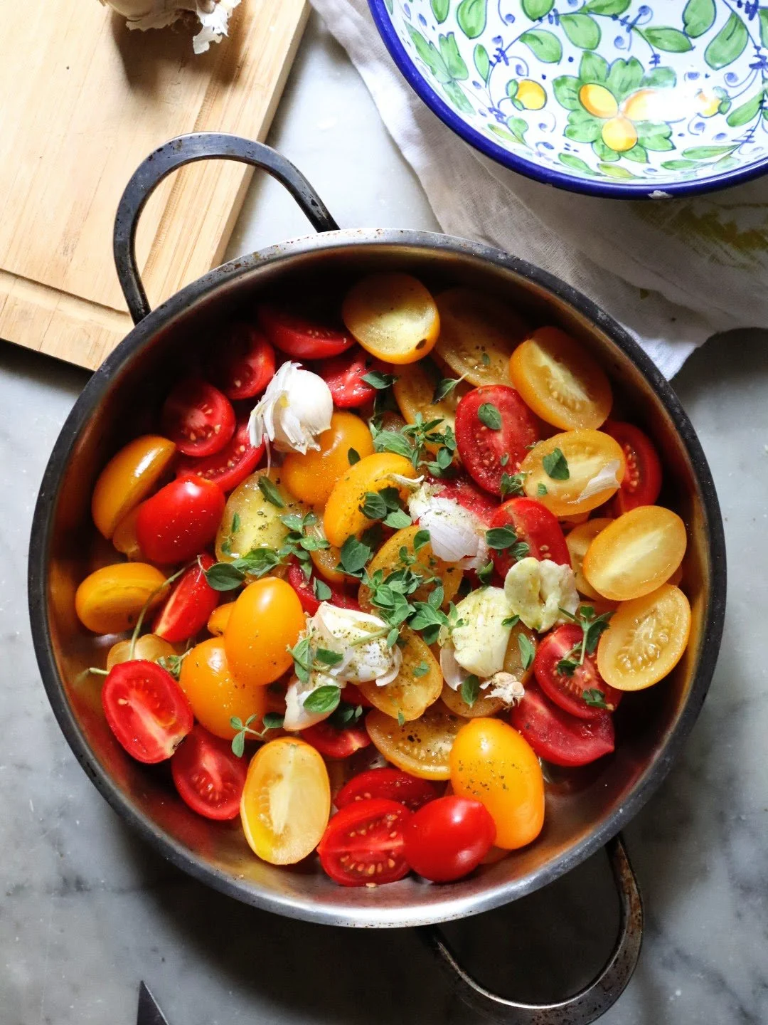 Cut tomatoes in half and place in a roasting pan along with the garlic cloves that have been smashed whole with skin on, salt to taste, a pinch of sugar, and several sprigs of oregano. If you can't find fresh oregano you can use a mixture of fresh herbs you have on hand like basil. Drizzle generously with EVOO and roast at 100 C or 225 F for about an hour. The tomatoes are done when they've shrunk a little, and have a deeper more vibrant color. They shouldn't be over caramelized as this dish shines when they still have a very fresh flavor that just pops