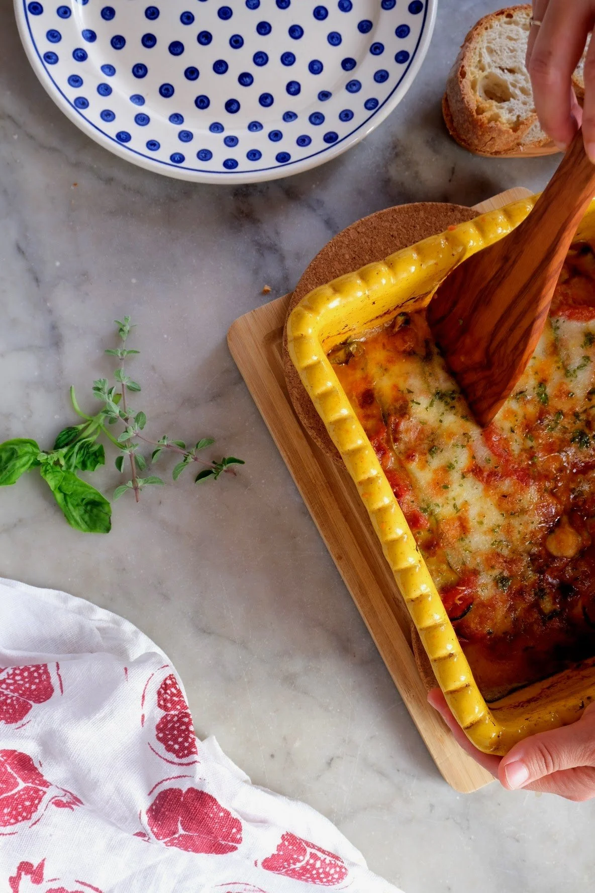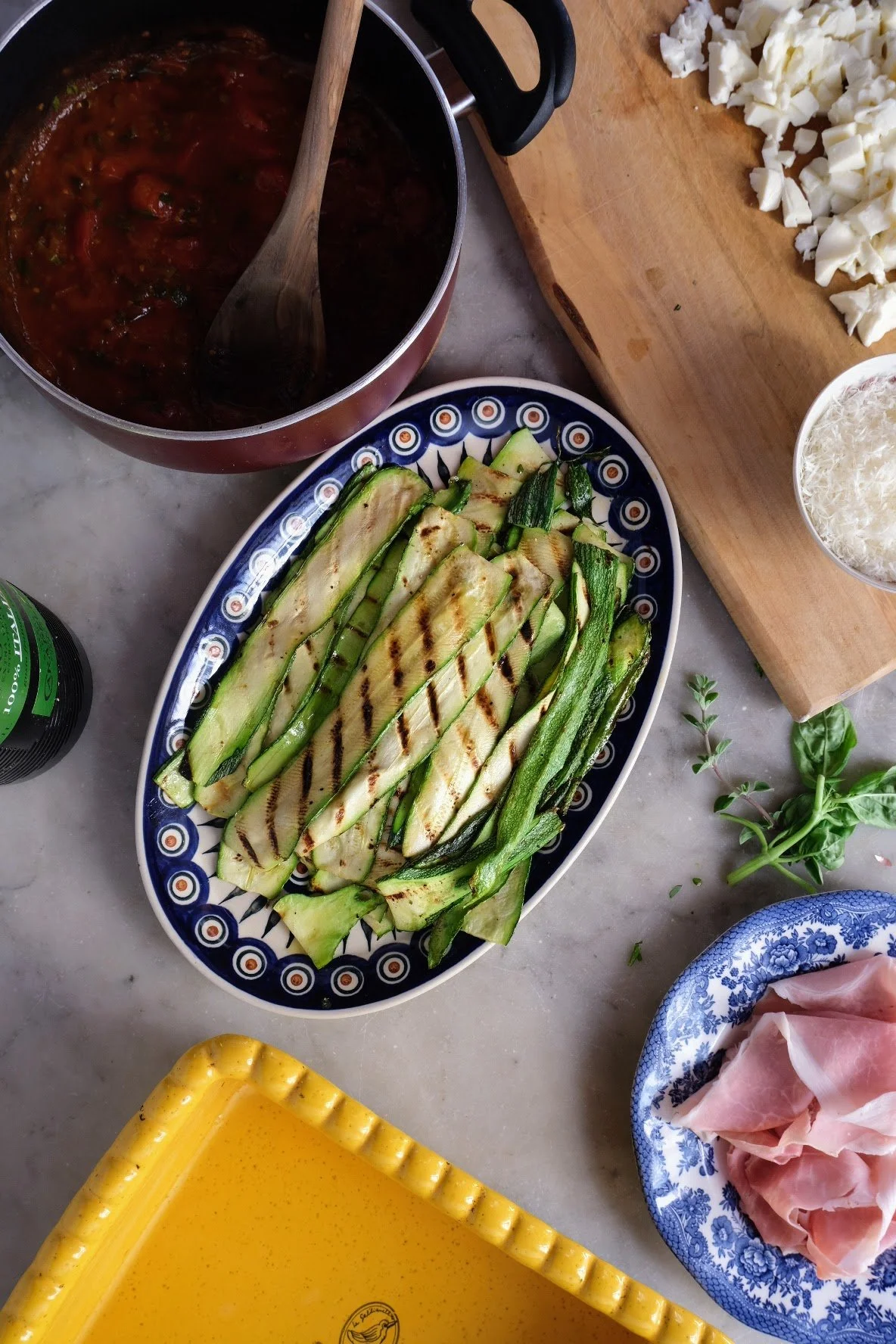 Pre-heat your oven to 180 C (350F). Take your baking pan, and drizzle some EVOO. Then add a thin layer of tomato sauce. Make a layer of the zucchini, then add pieces of the Prosciutto Cotto, add some mozzarella, sprinkle some grated cheese, a layer of sauce and repeat. The order in which you layer the ingredients is not a science, you can choose to layer as you wish since it will all bake together with the flavors melding. I do like to alternate the direction of the zucchini layer to create a nice stacked layer that creates a more solid network for cutting and serving after. Bake about 10 to 12 minutes, and then sprinkle the other half of the chopped herbs on top. Return the pan to the oven and bake an additional 10 minutes or until the top layer of cheese is completely melted and starting to blister. Remove from the oven and let it sit 5ish minutes before serving. Highly recommended to serve with some nice slices of thick, Tuscan bread.